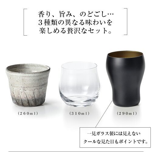 こちらは、お酒の芳醇な香りや濃厚な旨みを引きたてる3種類の形状のグラス・カップで飲み比べが楽しめるセットです。