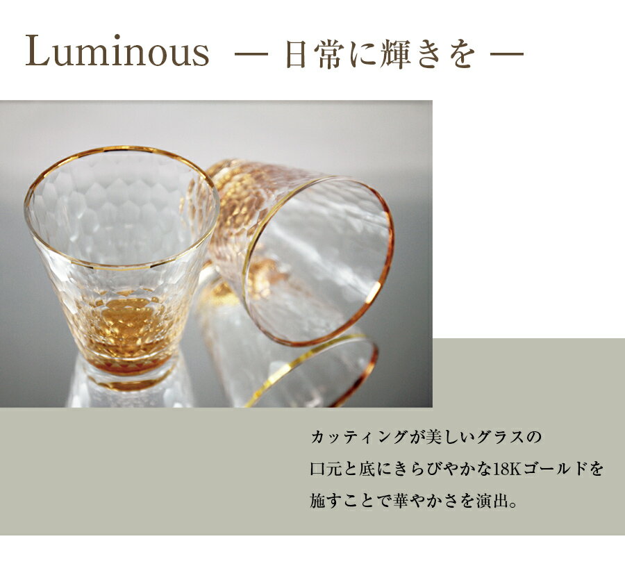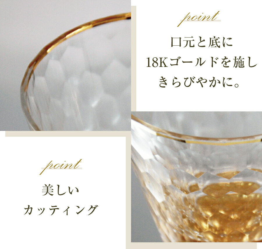 【ルミナス グラス(アンティーク風木箱入り)】 ?日常に輝きを? カッティングが美しいグラスの口元と底にきらびやかな18Kゴールドを施すことで華やかさを演出しました。