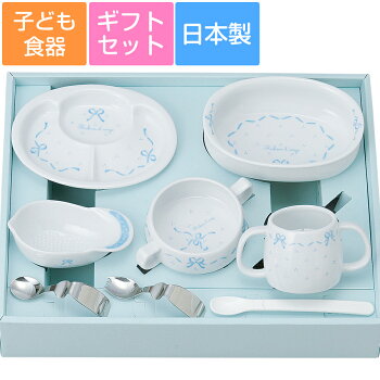 【子ども食器】【リボン・デ・アンジュ・ベビー食器セット】【化粧箱入】8点入り(ギフトボックス入り)ブルーのリボン柄 レンジ&食洗機対応 プレゼントにもおすすめ 日本製 kidsset 【金正陶器】【SOERU-ソエル-】 新生活 御祝い お祝い 入学祝い 就職祝い 退職祝い